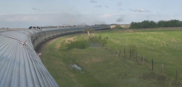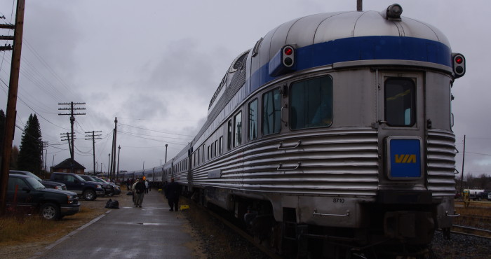 The last car on the train is a “Park Car”, so called because each is named for one of Canada’s national parks. Their distinguishing features are the rounded end and a glass dome where you get amazing views of all that spectacular scenery. I took this photo during the stop at Sioux Lookout, Ontario, under a heavy overcast.