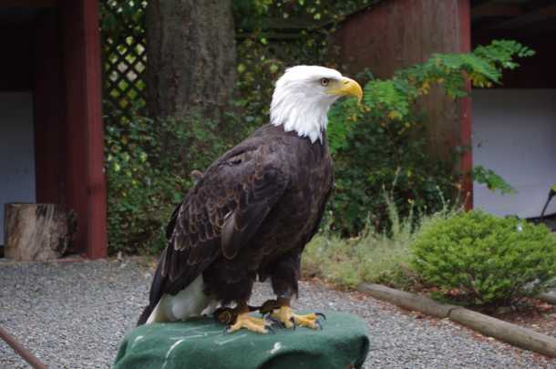 Several of the larger birds are kept tethered in individual open-air pens — this magnificent bald eagle is one of the “residents” — but all are allowed to fly free at night and all return to the facility of their own free will.