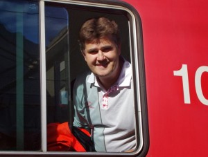 Finally, at Münster, a representative of the Matterhorn Gotthard Bahn, Christoph Andereggen appears in the doorway of the coach to escort me up to the locomotive for the 80-minute ride into Brig. We clambered up the metal ladder, shuffled sideways through a narrow passageway and into the locomotive cab where I shook hands with The Man… the engineer of today’s Glacier Express, Martin Gasser.