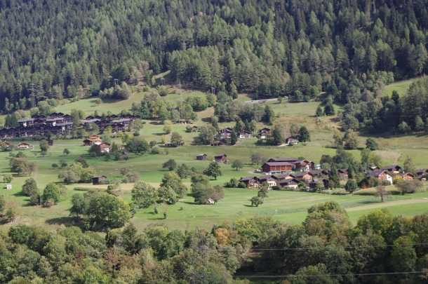 After an hour of gaping at the passing scenery, drink orders were taken and lunch was served. By this time, the train had slowed and begun its climb toward Oberalppass, at 6,670 feet is the highest point on the route. The landscape here is staggering: rugged peaks all around us, with scatterings of tidy houses and barns clinging precariously to steep emerald green flanks of the mountains. The valley floor is more than a thousand feet below.