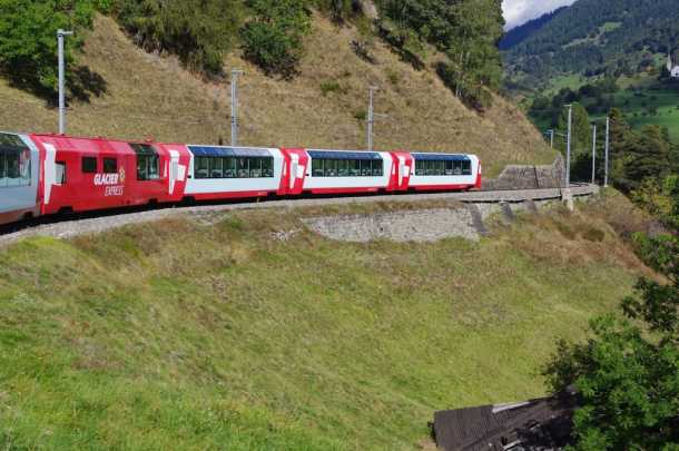 This isn’t a fast train — it averages just 25 miles an hour because of the curves and he grades — nor is it a very big train. One locomotive hauls two first class coaches, a service car where the food and drink is prepared, and three second class coaches. That’s it … and, in fact, that’ all that physics will allow. If the Glacier Express were to exceed 135 tons in total weight, the locomotive wouldn’t be able to get up several of the steep grades. One more coach and it would be over the limit.